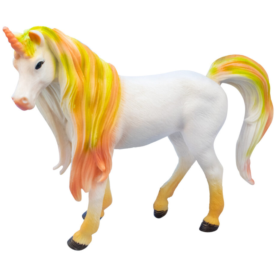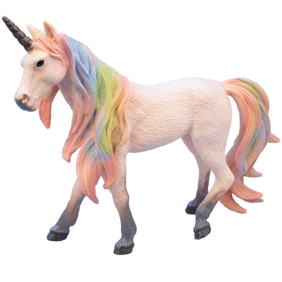 Фігурка єдинорога виконана за образом конячки з розкішною різнобарвною гривою та хвостом, а також яскравим рогом, що прикрашає голову. Ця граціозна тварина має ретельну деталізацію, тому може здатися, що це справжній скакун, лише у багато разів зменшений. Фігурка може стояти самостійно і відмінно послужить не тільки як іграшка, але і як колекційна фігурка, що прикрашає інтер'єр дитячої кімнати.
