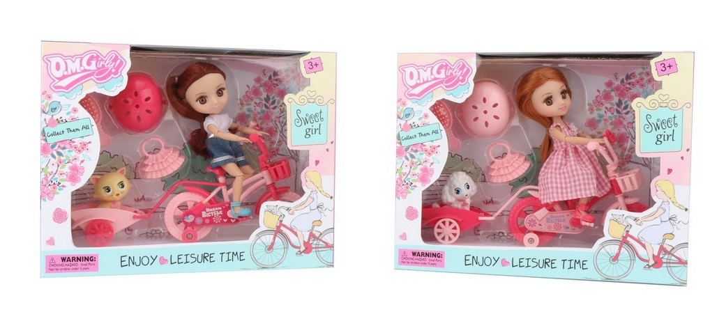 Комплектність набору: лялька, велосипед, щеня або кошеня, шолом, гребінець, сумочка.