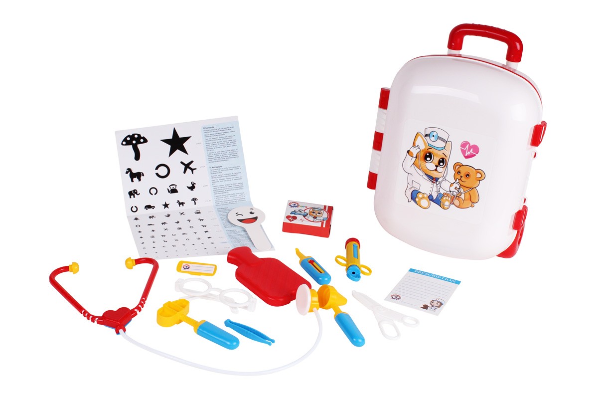 Всі іграшки виготовлені з якісних і безпечних матеріалів, не мають запаху. Склад набору: валіза, стетоскоп, молоточок, градусник, шприц, ножиці, грілка, пінцет, листок для виписування рецептів, іграшкова упаковка таблеток, «лікарські» окуляри і навіть спеціальна таблиця для перевірки зору