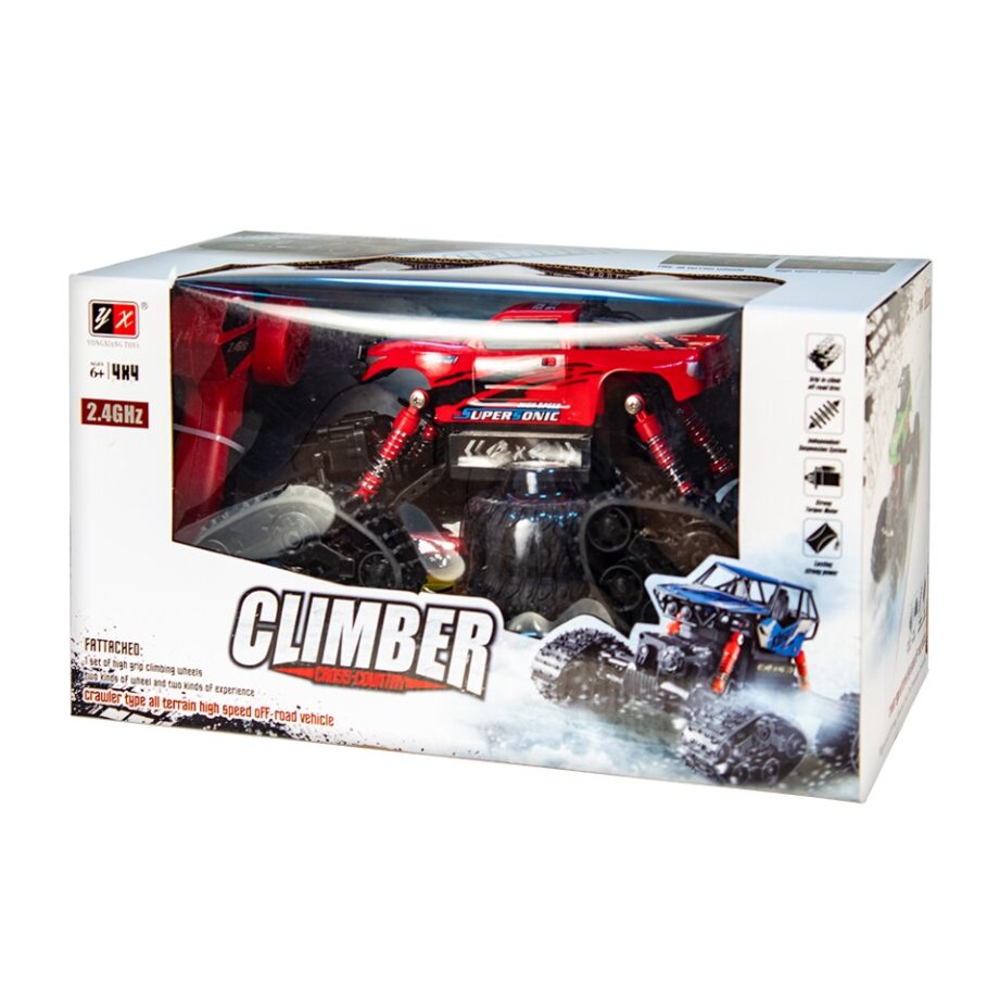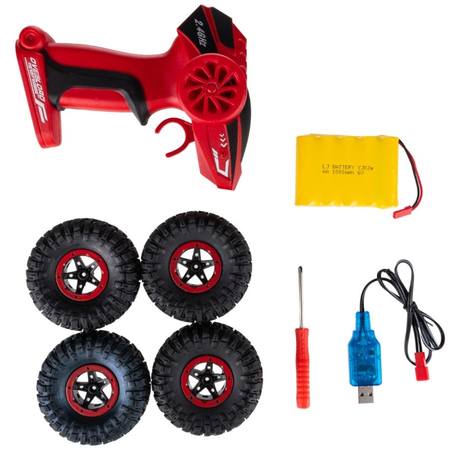 У наборі: позашляховик, пульт управління, USB-кабель, комплект шин (4 звичайні шини входять в комплект, 4 гусеничні шини знаходяться на машинці), акумуляторна батарея.