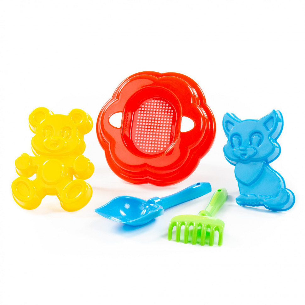 » » » Набір №293: ситечко-квітка велике, лопатка №5, грабельки №5, формочки (кошеня + ведмідь), лійка мала №4