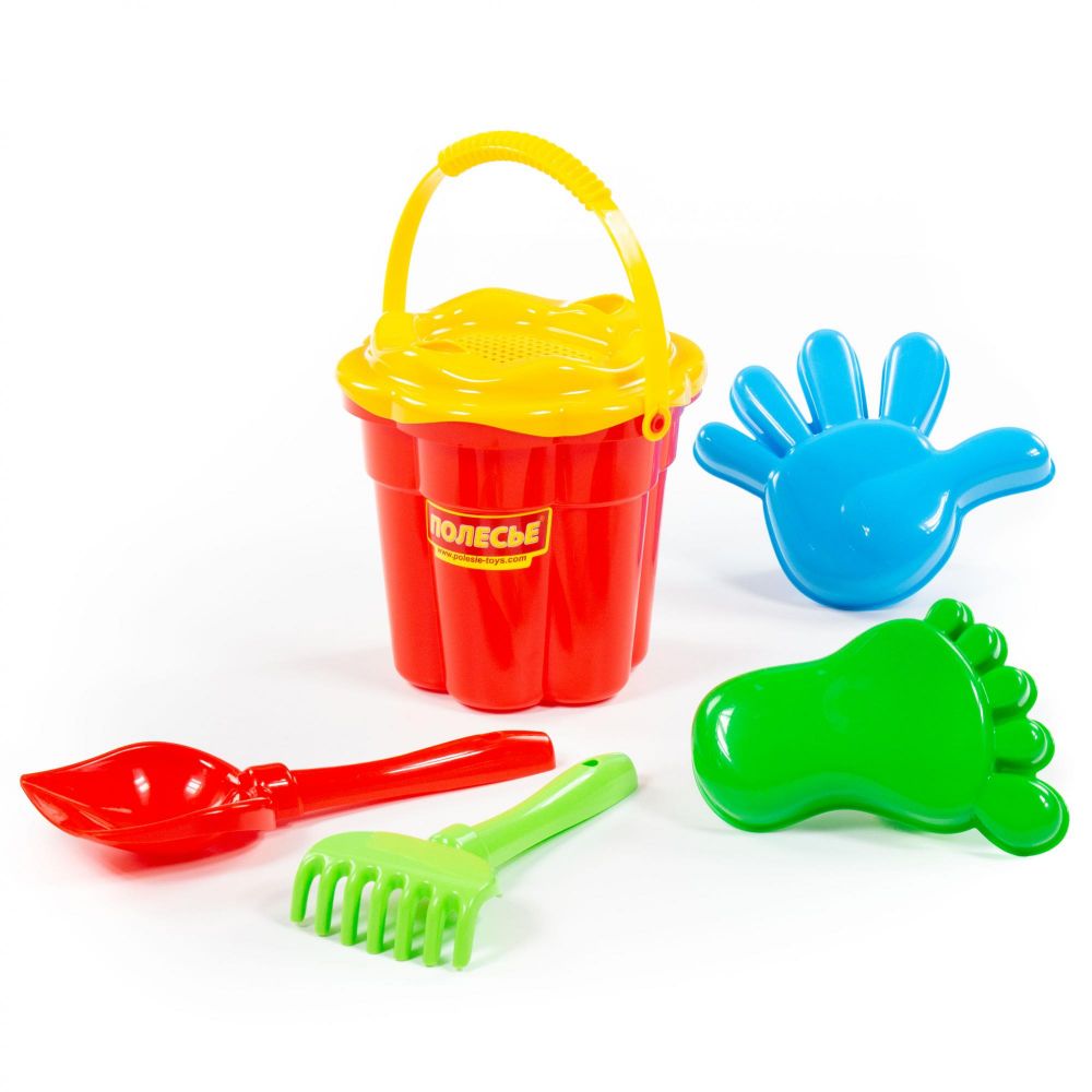 Для того щоб грати в пісочниці було корисно і цікаво, подаруйте малюкові набір іграшок для пісочниці від компанії «Полісся». Набір включає в себе яскраві аксесуари, які дозволять малюку не тільки весело провести час, а допоможуть у розвитку багатьох навичок: дрібної моторики пальчиків, тактильних відчуттів і сенсорного сприйняття, творчих здібностей та уяви. Ігрове приладдя легке і компактне, тому дитина буде із задоволенням носити його самостійно. Всі елементи набору виготовлені із якісного пластику, за яким легко доглядати, при цьому він не втрачає своїх споживчих властивостей. У наборі: відро-квітка середня 3 (14,5х14,5х10, об'єм 1,6 л), ситечко-квітка середня 3 (ширина - 16 см), лопатка 5 (довжина - 22,5 см), грабельки 5 (довжина) - 18 см), формочки: 1 долонька (13,5х14,5 см) + 1 ніжка (14х8,5 см).