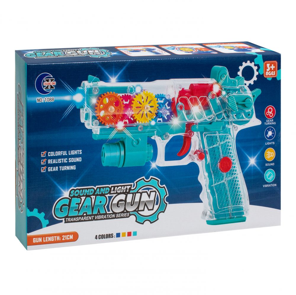Один з головних аспектів функціоналу цього іграшкового пістолета - це шестерня, розташована всередині корпусу. Для активації динамічного механізму дитина може легко натиснути на важіль, і кольорові шестерні, розташовані всередині, починають обертатися, створюючи захоплюючу візуальну симфонію руху.