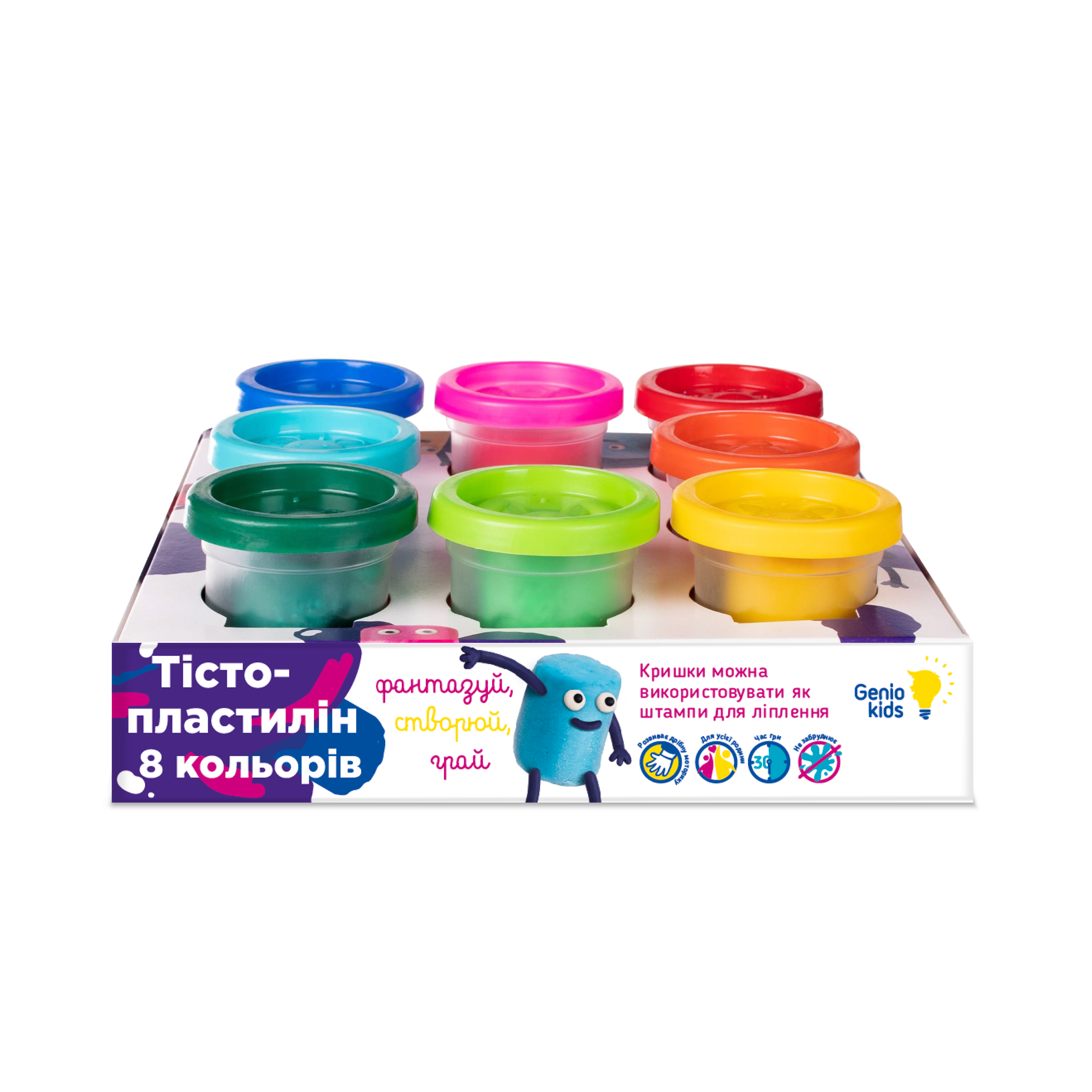 Склад набору: тісто-пластилін в баночках із кришками-штампиками, 8 кольорів (базові та неонові: червоний, жовтий, синій, зелений) по 50 гр.