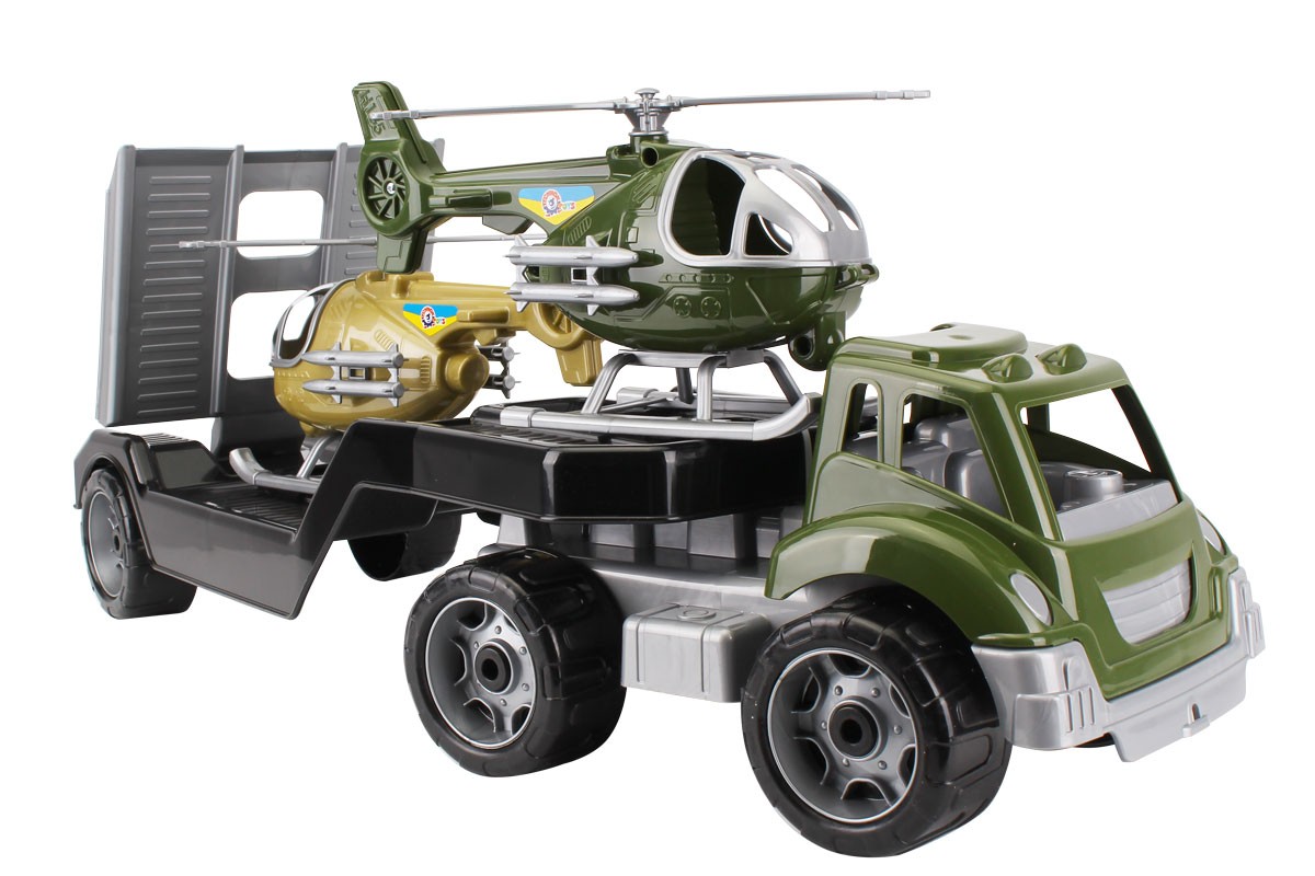 Набір "військового транспорту "серії" мілітарі" - це великий автовоз із двома гелікоптерами. Вони поспішають допомогти військом у небезпечних зонах. Транспорт у захисних кольорах: хакі, сірий, чорний та пісочний легко приховати на різній місцевості.