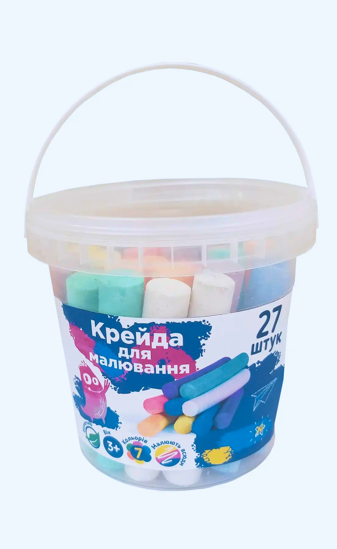 Довжина крейди 9,5 см, діаметр 1,8 см - великі і міцні. Упаковані в пластикове відерце, в якому зручно як переносити крейду, так і зберігати до наступного заняття творчістю. Підходять для малювання на різних поверхнях: асфальті, папері, крейдяній дошці. Склад крейди: крейда, гіпс, барвник, вода.