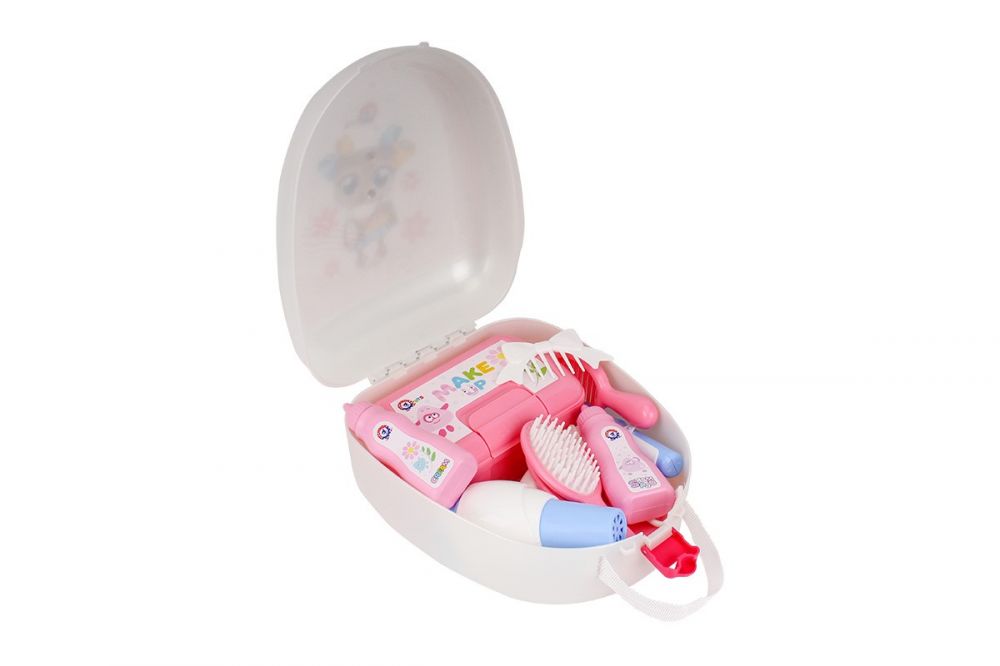 У ньому стільки красивих та необхідних для щоденного догляду аксесуарів. Гребінець, щітка, фен та плойка для розчісування волосся та цікавих зачісок. Всі дрібні аксесуари зручно зберігати у великій рожевій косметичці, яку можна брати із собою в садок, на прогулянку чи гості до друзів. Тепер все необхідне під рукою, щоб поправити макіяж та зачіску.