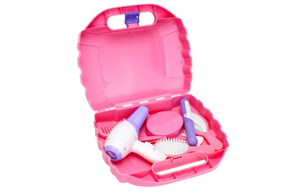 У комплекті є все необхідне для щоденного догляду: гребінець, щітка та шпилька у формі бантика для модної зачіски. Якщо ж хочеться кучерявих локонів - знадобиться плойка. Дзеркальце з ручкою, пінцет та пудрениця завжди будуть під рукою для ідеального макіяжу. А щоб добре просушити волосся і зробити легке укладання, слід використовувати фен. Тепер у маленької модниці все буде все, як у мами. Розміри іграшкового приладдя оптимально розраховані для дівчаток. Також їх можна взяти з собою в сумочку на прогулянку або дитячий садок.