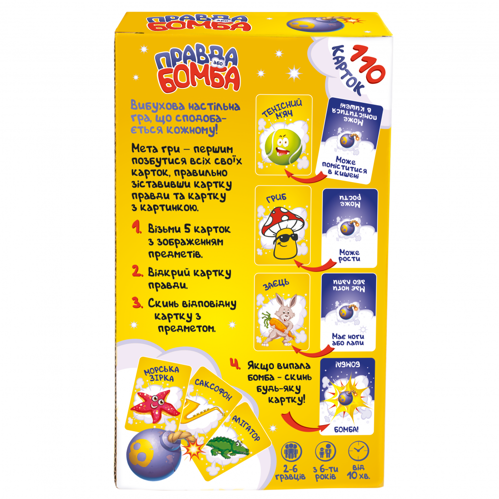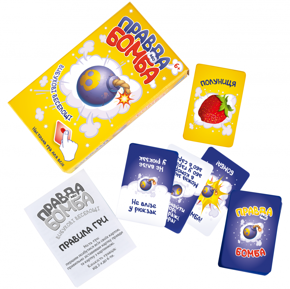 «Правда або Бомба» - вибухова настільна гра, що сподобається кожному! Гра розвиває моторику, реакцію, асоціативні навички і дарує безліч позитивних емоцій. Мета гри: вірно співвіднести картку правди і картку з зображенням та першим позбутися всіх своїх карт. Наприклад: хто з гравців швидше за інших знайде картку з предметом, який може поміститися в кишені? Або відшукай зображений предмет, який може бути солодким на смак або м'яким на дотик? Випала картка «Бомба» - швидше скидай будь-яку карту!