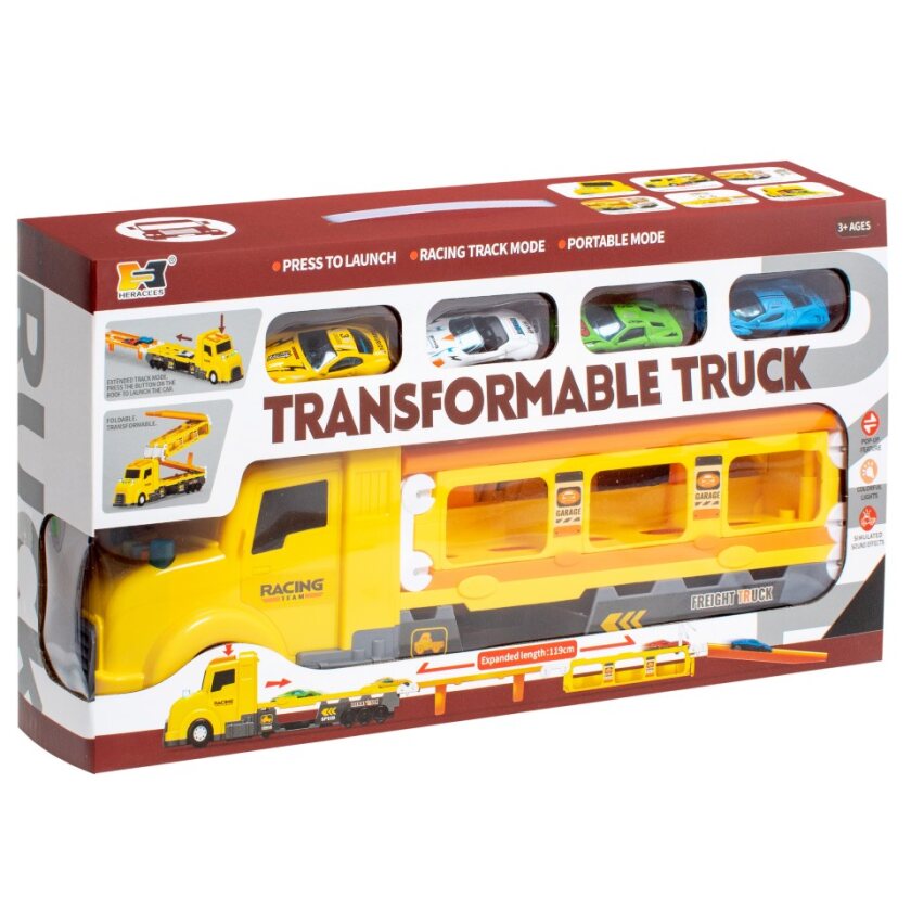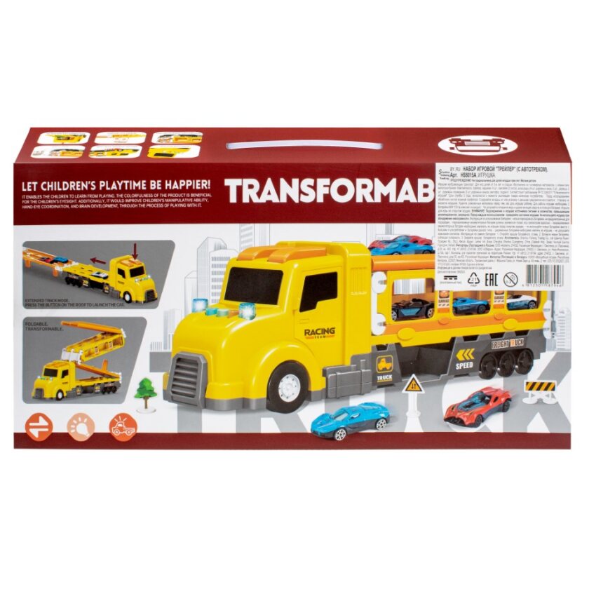 У наборі є все необхідне, щоб весело провести час із улюбленими іграшками кожного хлопчика – машинками. У комплекті, крім великого трейлера для перевезення, є 4 машинки, які можна запускати автотреком. У процесі гри трейлер легко можна переобладнати в трек з двома гоночними смугами, по яких можна влаштувати справжній драг-рейсинг (перегонове змагання, що є спринтерським заїздом), а аксесуари, в комплекті, допоможуть домогтися справжньої реалістичності. На даху трейлера є кнопки, які і запускають машинки по треку, а кнопки на капоті відповідають за включення та вимкнення світлових та звукових ефектів трейлера. Деталь, яка є задньою частиною трейлера, можна в процесі гри встановити на автотрек як перешкоду.