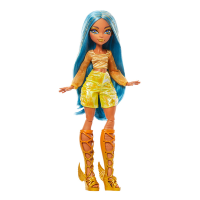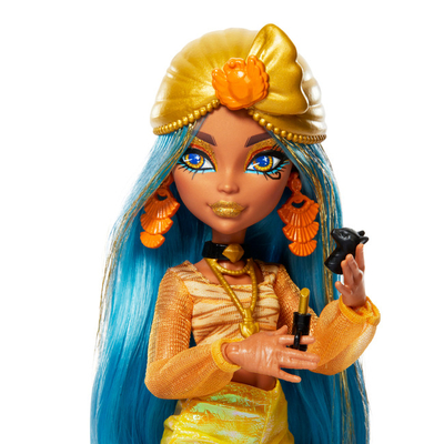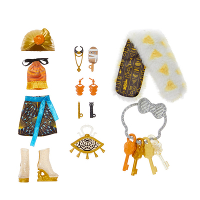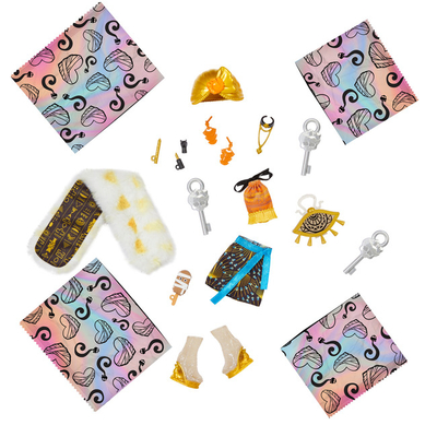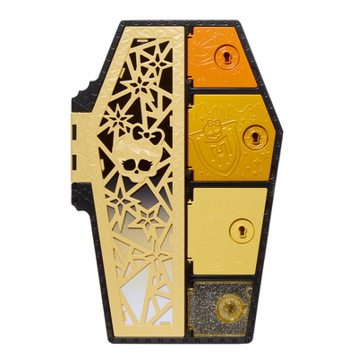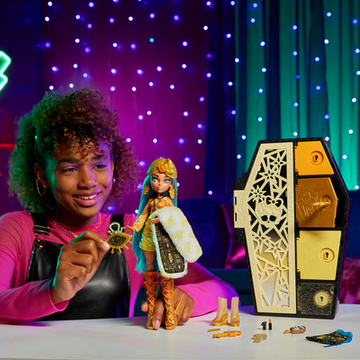 Набір-сюрприз Monster High Відпадний стиль Жахо-секрети Клео відкриє скелети в шафі, що ховає ця монстро-учениця! Шафа різних відтінків жовтого містить 18 сюрпризів, серед яких модне вбрання, аксесуари та тематичні предмети, які якнайкраще підкреслюють образ ляльки. Лялька вдягнена у відпадний наряд — кофту з цікавим принтом, що нагадує обмотки мумії, блискучі жовті шорти та високі чоботи з оригінальним дизайном. Відкрийте найбільший відсік, всередині ховається розкішна Клео де Ніл! А що заховано в інших шафках? Кортить дізнатись! Для цього знадобиться ключ. Занурте його у теплу воду та погляньте на ефект «Кольорового перевтілення». Тепер ключ такого ж кольору, як і дверці, які можна ним відкрити. А всередині знову фантастичні подарунки та наступний ключ. Повторюйте гру з перевтіленням, поки не будуть відкриті усі відсіки і знайдені усі сюрпризи!