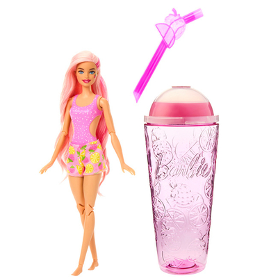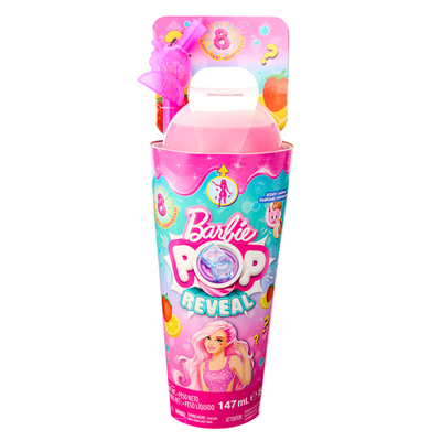 Лялька Barbie Pop Reveal Полуничний лимонад - найновіше фруктове перетворення улюбленої Barbie! На вашу дівчинку чекає новий неймовірний досвід розпакування із сюрпризами — їх тут 8! Усередині стаканчика ви побачите загадкові пакетики, в яких приховано: неймовірно красива блондинка Barbie з розкішним довгим волоссям з ароматом полуничного лимонаду; яскраві шорти з принтом у полуниці та лимони; кумедне щеня; рятувальний круг для нього у формі ягідки полуниці. Проткніть соломинкою кришку склянки! Дивіться - кольоровий слайм із кришки стікає прямо в стаканчик і покриває маленькі упаковки у формі кубиків льоду. Дістаньте кубики зі слайма і розкрийте, щоб знайти ролики та міні-стаканчик для ляльки Barbie.