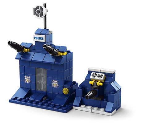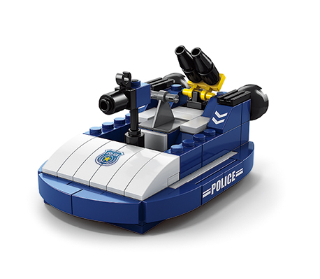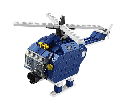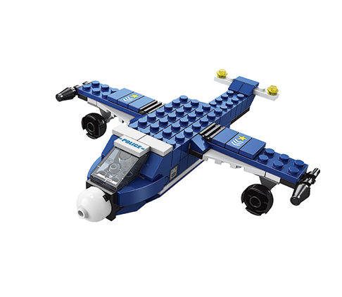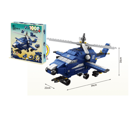 З 1000 деталей можна зібрати 6 окремих елементів: поліцейський гелікоптер, поліцейський літак, поліцейська станція, поліцейський скутер - 2 штуки, поліцейська машина. Всі елементи об'єднуються у великий виріб - гелікоптер. Конструктор легосумісний, у кожній упаковці є інструкція – детальна, кольорова, наклейки для оздоблення готових виробів, деталі, посортовані в пакети. Елементи конструктора вироблені з пластику. Конструювання розвиває дрібну моторику та допомагає тренувати координацію рухів.