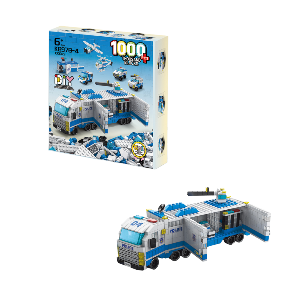 З 1000 деталей можна зібрати 6 окремих елементів: поліцейський гелікоптер, поліцейський літак, поліцейську станцію, поліцейську машину - 3 штуки. Всі елементи об'єднуються у великий виріб - поліцейську машину. Конструктор легосумісний, у кожній упаковці є інструкція – детальна, кольорова, наклейки для оздоблення готових виробів, деталі, посортовані в пакети. Елементи конструктора вироблені з пластику. Конструювання розвиває дрібну моторику та допомагає тренувати координацію рухів.