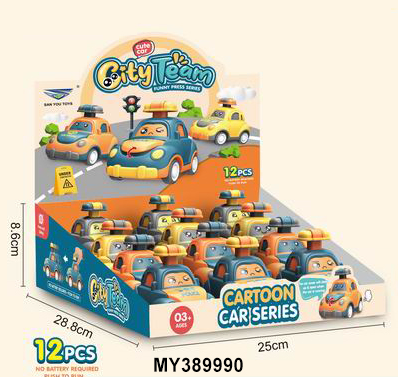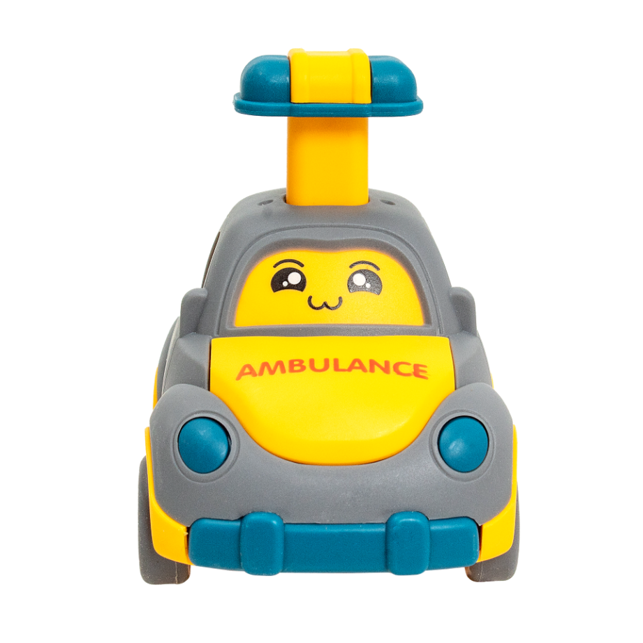 Машинка інерційна з кнопкою запуску. У машинки відчиняється капот. В асортименті 4 кольори та види: швидка допомога, поліція, пожеежна машинка, таксі. Розмір машинки: 9,3*6,1*8,5 см. У дисплеї - 12шт.