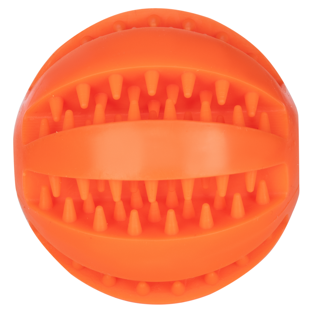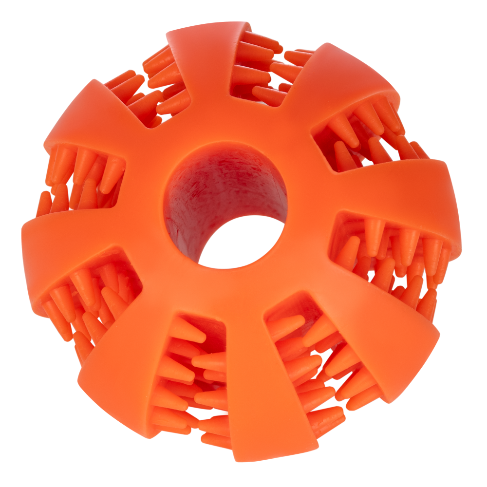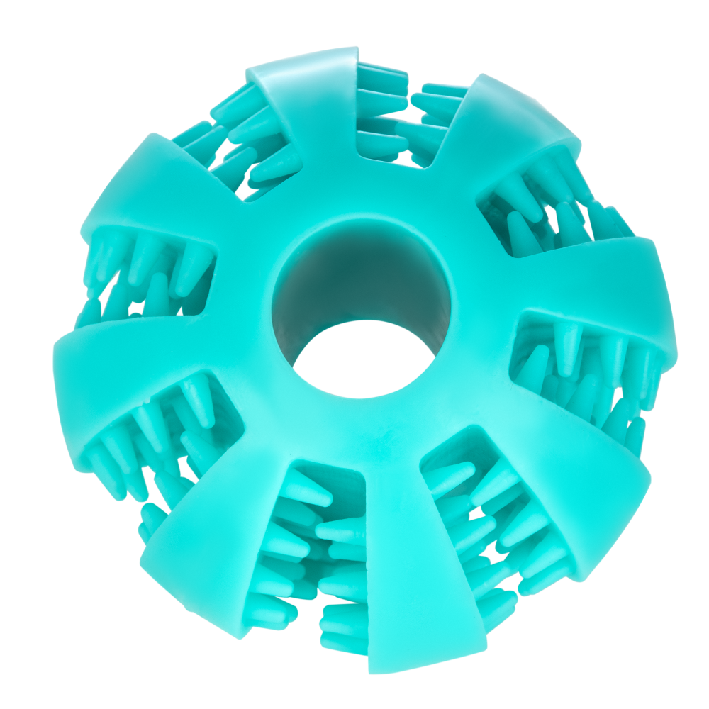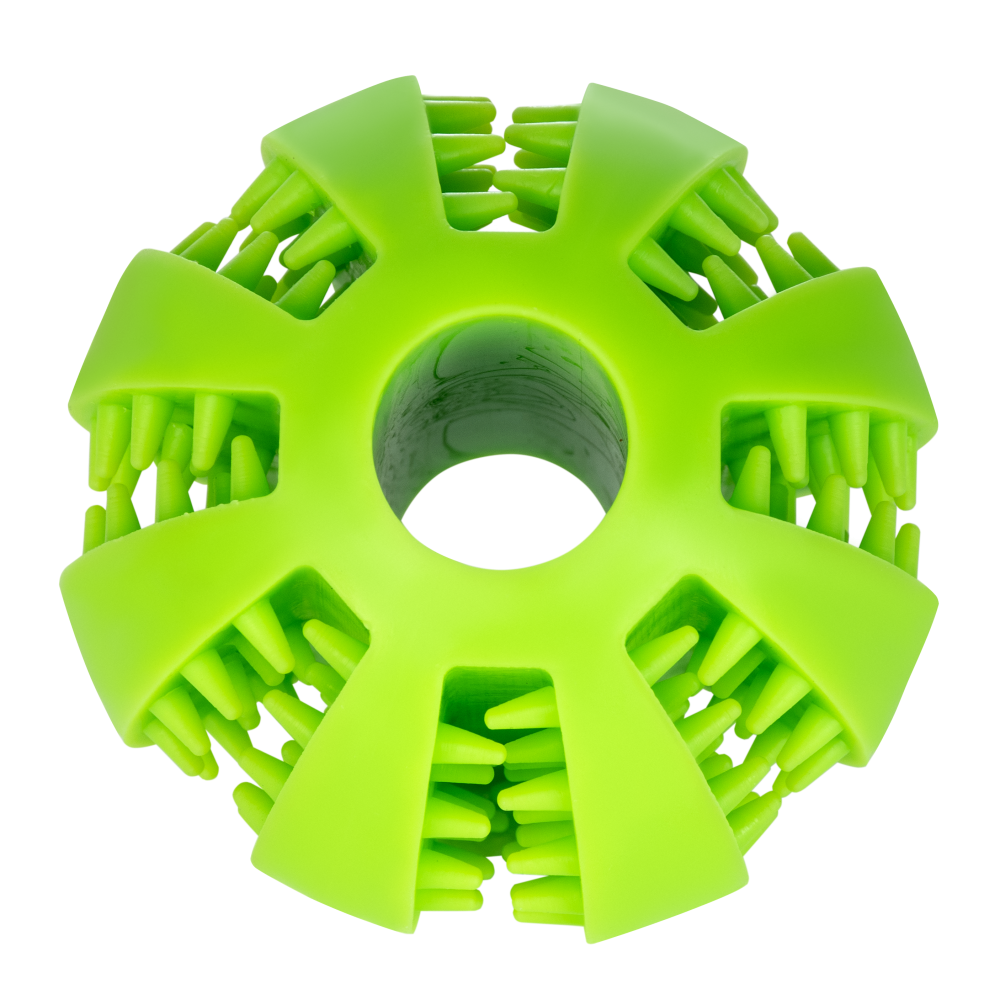 Жувальний м'яч-годівниця для собак з отворами для ласощів. Отвори м'яча можна наповнити кормом або ласощами і використовувати для активних ігор, що розвивають, допомагає в дресируванні або може надовго зайняти вихованця. Іграшка допомагає зберегти здоров'я зубів та ясен собаки: жувальний м'яч підійде для масажу ясен, розвитку щелепного апарату, а м'які шипи сприяють дбайливому очищенню зубів вихованця від нальоту. Цю іграшку можна використовувати для повільного годування вихованця.