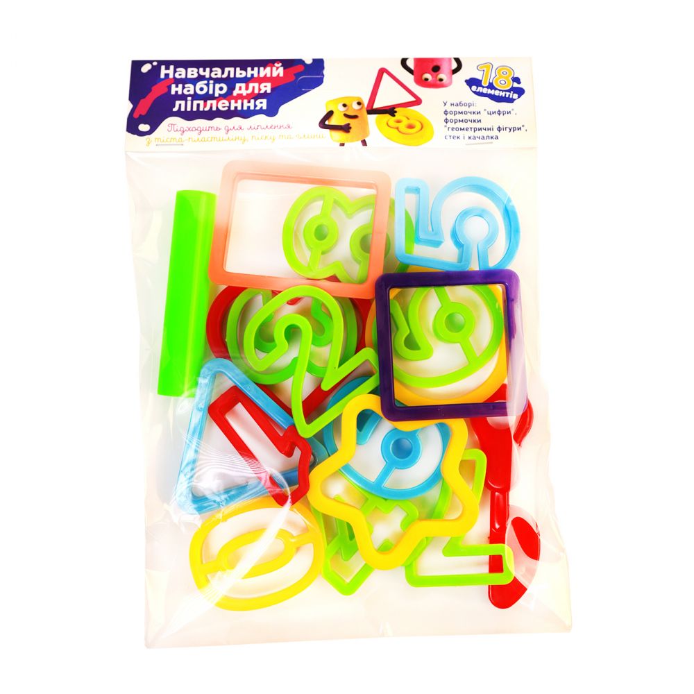 Склад набору: формочки у вигляді цифр - 10 шт., формочки у вигляді геометричних фігур - 6 шт., стек-ніж - 1 шт., качалка - 1 шт.