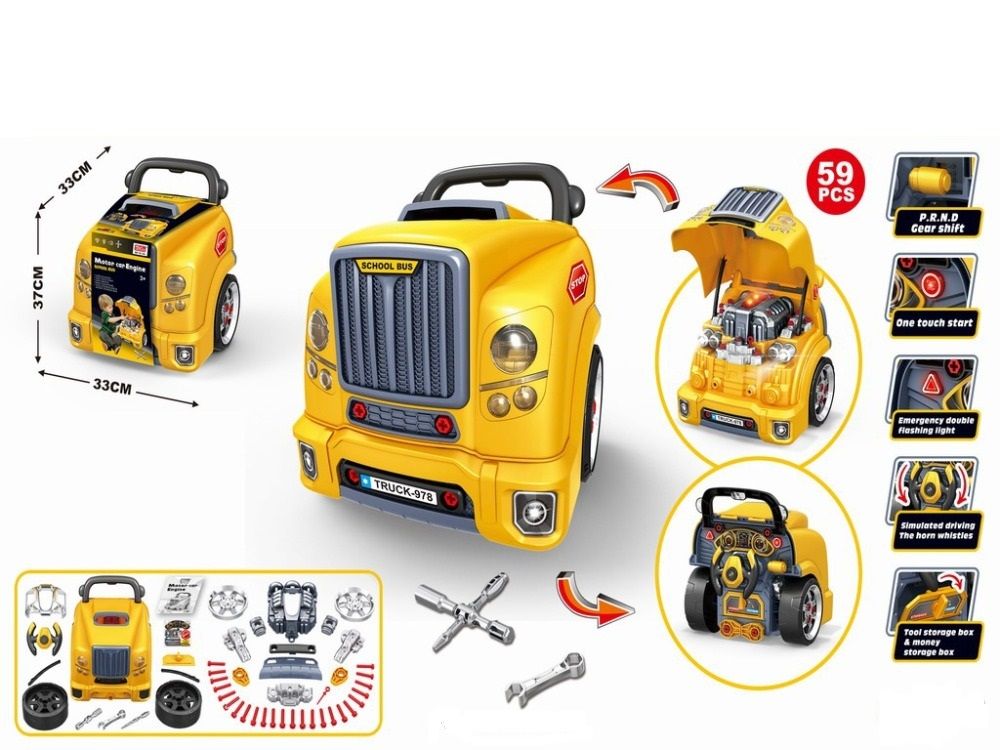 Майстерня автомобільних двигунів. Двигун іграшкової машини, який можна розібрати і зібрати заново. Світловий і звуковий двигун з кнопкою запуску. Світлодіодні фари з аварійним миготінням. Обертовий кермо з звуковим сигналом. Аксесуарів 59 шт.