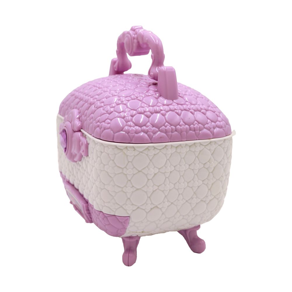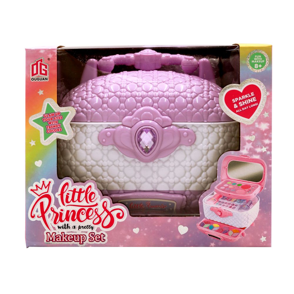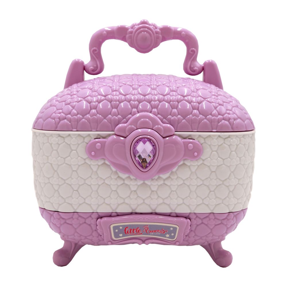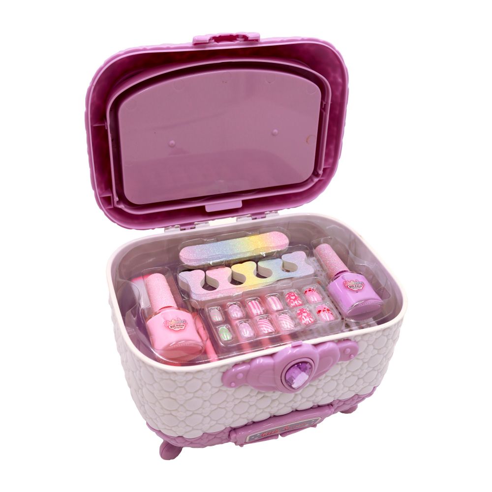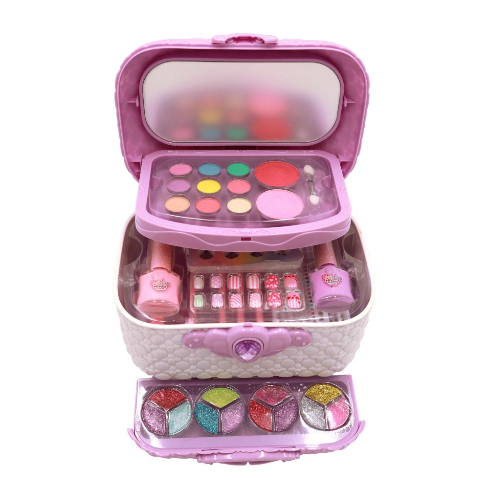 Набір косметики у красивій скринці. В скрині і є все, що потрібно для маленької модниці: тіні для повік пастельні та яскраві, з глітером, також рум'яна, пензлики для нанесення макіяжу, лаки для нігтів, пилочка та розділювач для пальців, накладні нігті та наклейки, дзеркало. Коли всі складові набору буде використано скриня може й надалі слугувати дівчинці-органайзером для прикрас, аксесуарів, резинок чи нової косметики.