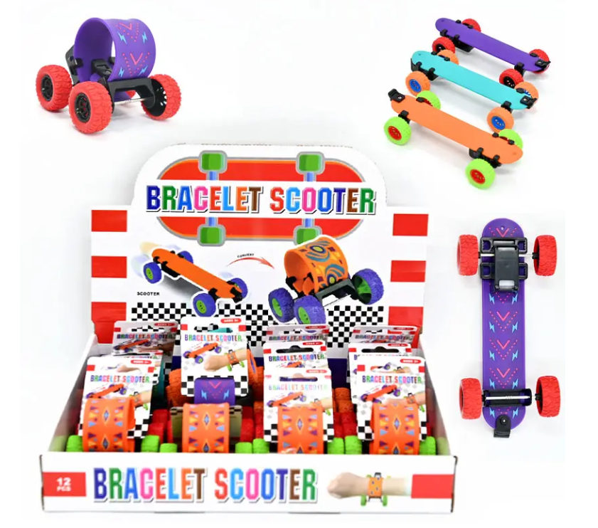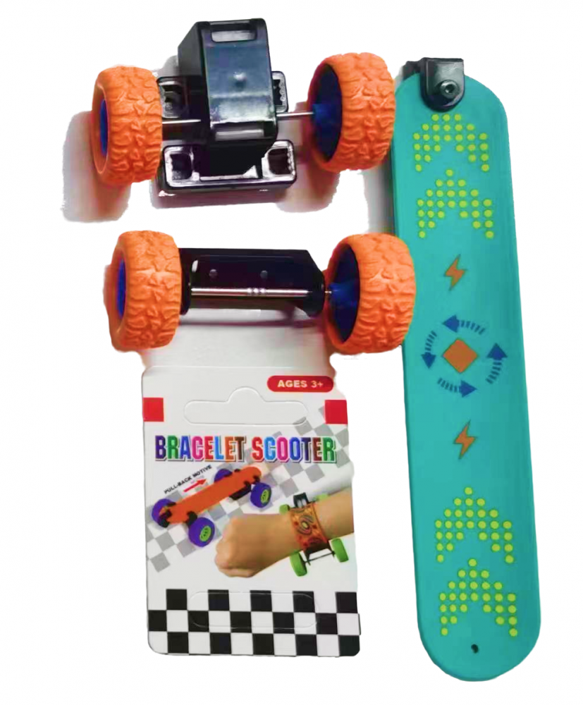Іграшковий скейт-браслет з колесами. Іграшка може слугувати і транспортним засобом з pull back механізмом , і браслетом, який легко скручується на зап'ястку.