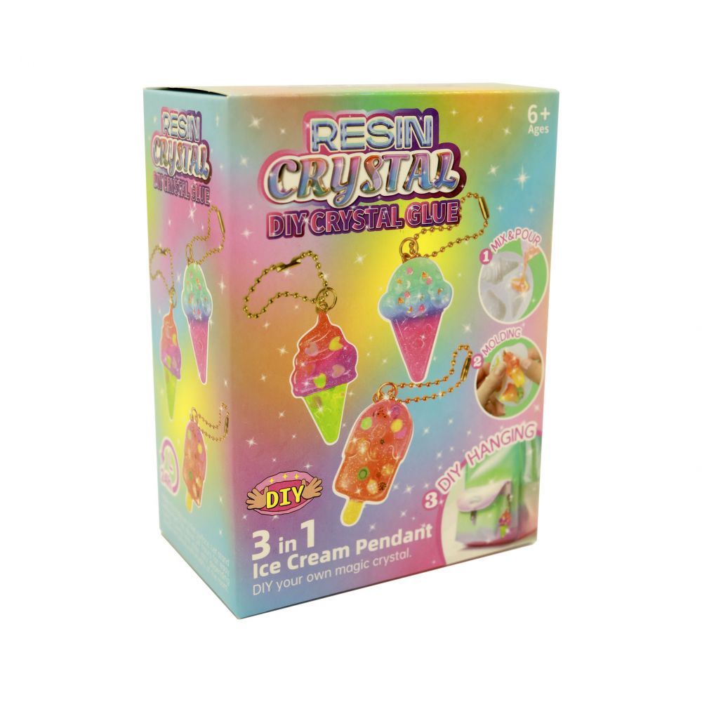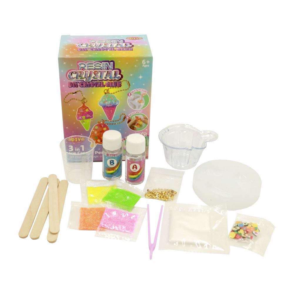У складі набору: 2 баночки з епоксидною смолою, 4 види блискіток, прикраси, ланцюжки, молд силіконовий-3 фігурки тематика морозиво, мірна склянка , склянка для замішування,, пінцет пластиковий, дерев'яні лопатки, рукавички, інструкція.