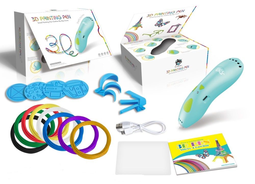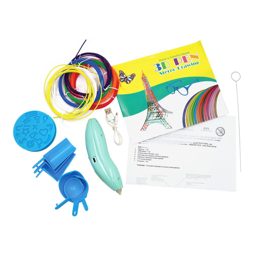 Зручна у використанні функціональна 3Д ручка. До складу набору входить ручка, 8 стержнів різних кольорів, заготовки для створення об'ємних предметів, кольорова книжечка із зразками готових виробів, 3,7V-літієва батарея, USB-зарядний пристрій, інструкція.