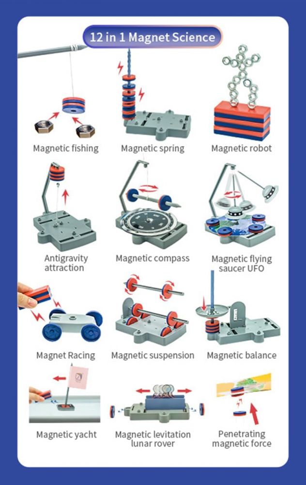 Набір для експериментів з магнітом 12 в 1. У набір входять магніти різних форм і розмірів, а також різноманітні аксесуари, необхідні для захоплюючих експериментів. Також у комплекті є докладна інструкція з покроковим описом кожного експерименту та ілюстраціями. За допомогою набору дитина зможе вивчати властивості магнітів, вивчати взаємодію магнітів з різними матеріалами, знайомитися з поняттями магнітних полів і полюсів.