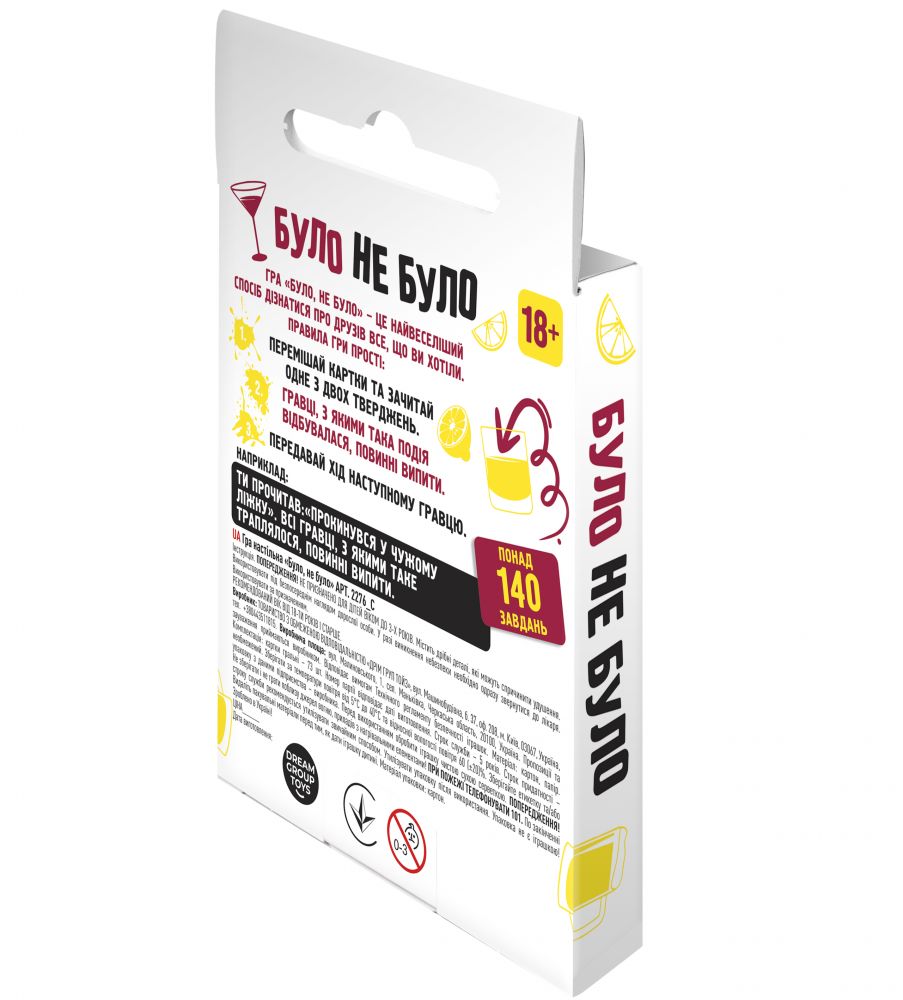 Гра «Було, не було» - це найвеселіший спосіб дізнатися про друзів все, що ви хотіли. Суть гри проста: перемішай картки та зачитай будь-яке з двох тверджень. Гравці, з якими таке відбувалося, мають випити. Призначена для дорослих віком від 18 років.