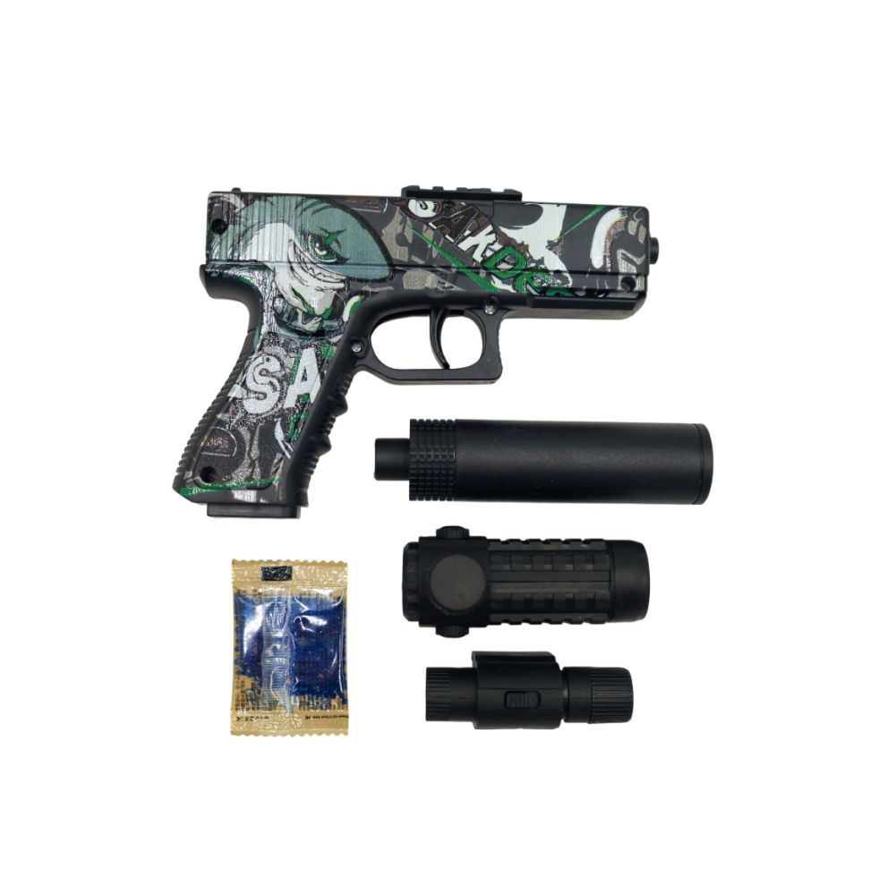 Іграшкова зброя Пістолет з глушником. Іграшковий пістолет, який стріляє гідрогелевими кулями. Кулі для гри вирощуються дуже просто: насипте трохи вмісту пакетика в ємність і залийте водою, через декілька годин ваші снаряди гелю готові . Пістолет простий у використанні необхідно зарядити його кулями і натиснути на курок. Іграшка також має приціл зі світлом. Швидка швидкість та дальня стрілянина (≈ 20 м) допоможуть організувати цікаві, активні та захоплюючі ігри. У набір входить: пістолет , глушник, пакетик куль 500 шт., магазин, батерейки 2*AG10 в комплекті.Матеріал іграшки: ABS .