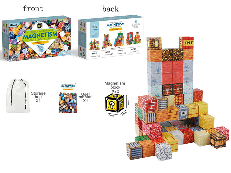 | Розвиваючий набір з 72 кубиків у стилі blind-box (сюрприз у кожному блоці). Кубики з’єднуються між собою за допомогою магнітів, що дозволяє створювати цікаві конструкції, форми, башти й навіть будівлі в стилі Minecraft. У комплекті: 72 магнітні блоки (розмір 2×2×2 см), мішечок для зберігання, інструкція. |