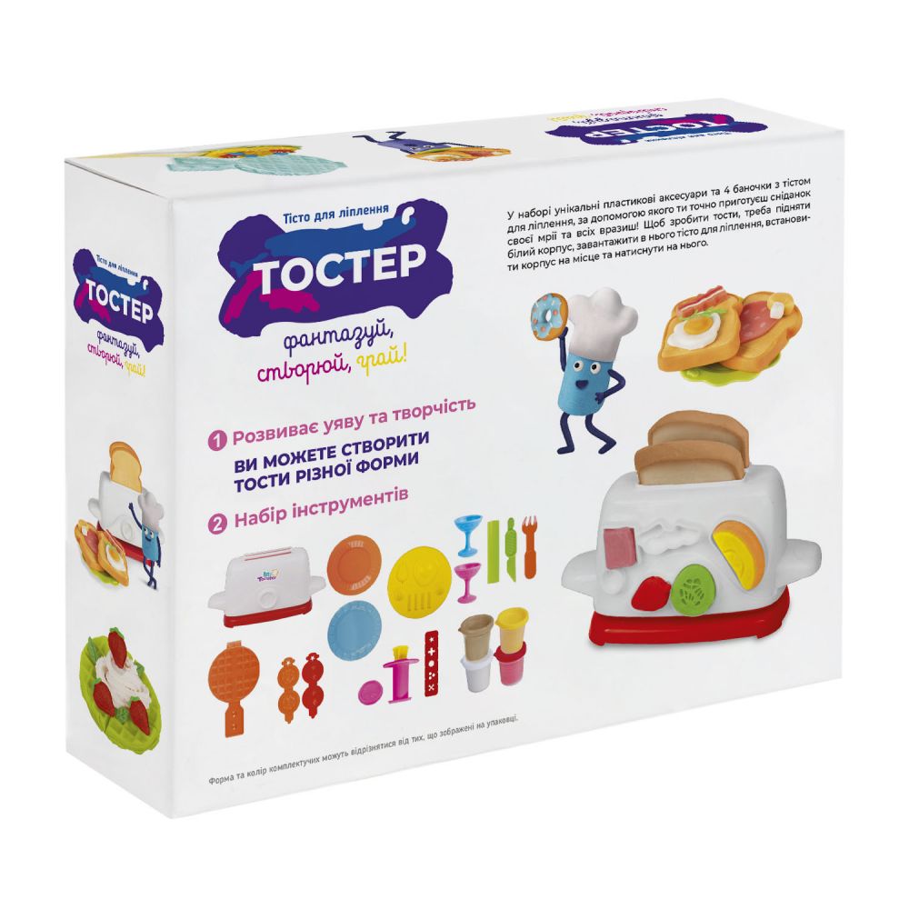 Набір тіста для ліплення з унікальними аксесуарами для створення тостів. Склад: тісто для ліплення - 4 шт. по 50g(г), тостер - 1 шт., підставка з формочками - 1 шт., вафельниця - 1 шт., вазочка для морозива - 2 шт., тарілка - 2 шт., форми-штампики - 2 шт., шприц-давилка - 1 шт., кришка-штампик – 1 шт., вставка-вкладиш – 1 шт., штамп-форма - 1 шт., качалка, стек, виделка.