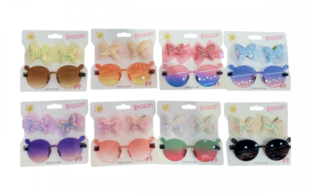 Набір складається з сонцезахисних окулярів та двох резинок для волосся. Яскраві аксесуари чудово доповнять літній образ. Матеріал: пластик, метал, текстиль. Пакування: пакет.